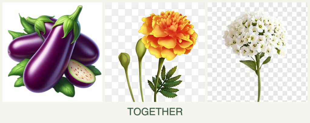 - Pest Control: Marigolds are known for their ability to repel nematodes and other pests, which can benefit eggplants. Alyssum attracts beneficial insects like hoverflies, which can help control aphid populations.