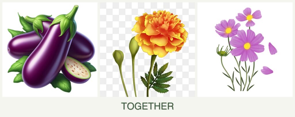 Planting eggplant, marigolds, and cosmos together offers several advantages: