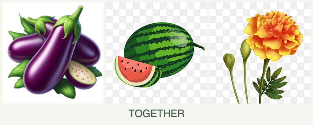 - Watering Needs: While eggplants and marigolds prefer moderate watering, melons need more consistent moisture.