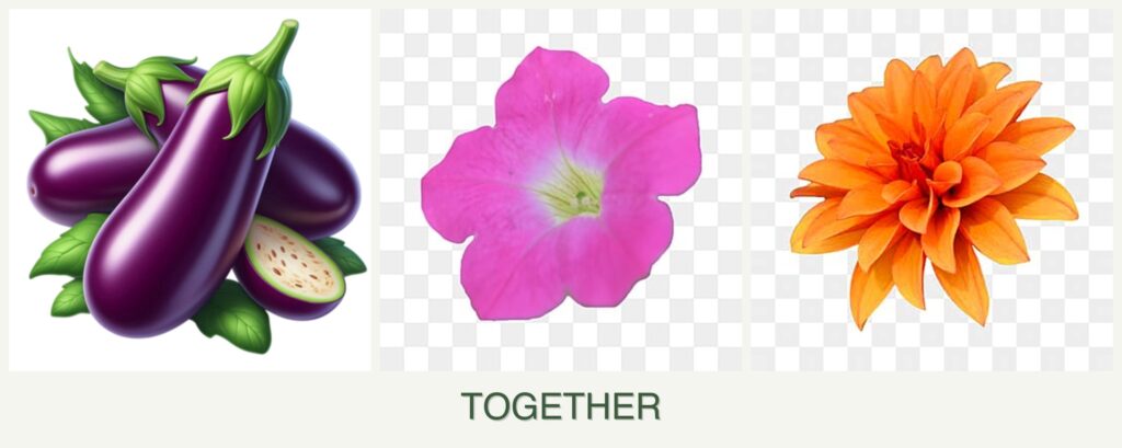 - Pollinator Attraction: Dahlias and petunias attract pollinators, which can benefit eggplant fruiting.