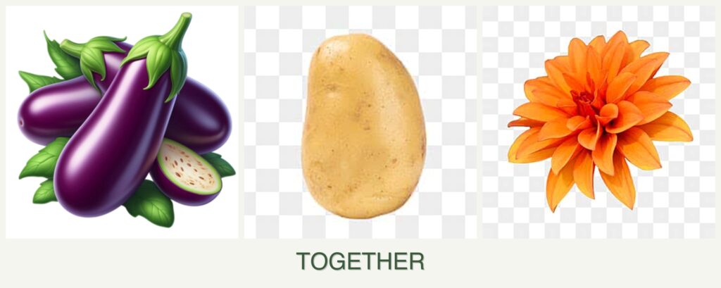 - Growth Requirements: Eggplants and potatoes require full sun, while dahlias can tolerate partial shade.