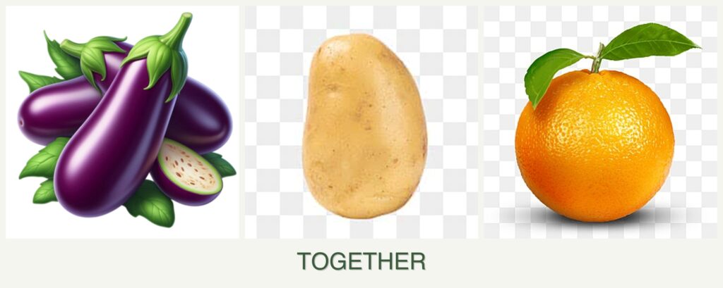 - Growth Requirements: Eggplants and potatoes require full sun and well-drained soil, while oranges need more space and specific soil conditions.