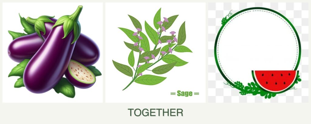 - Growth Requirements: Eggplants and sage prefer well-drained soil and full sun, while watermelons need a lot of space and warm conditions.