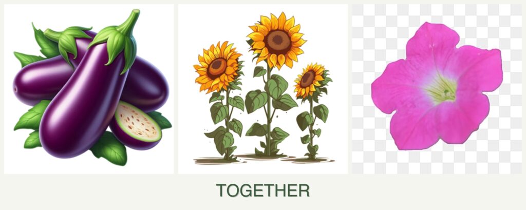 - Pollinator Attraction: Petunias and sunflowers attract bees and other pollinators, enhancing fruit set in eggplants.