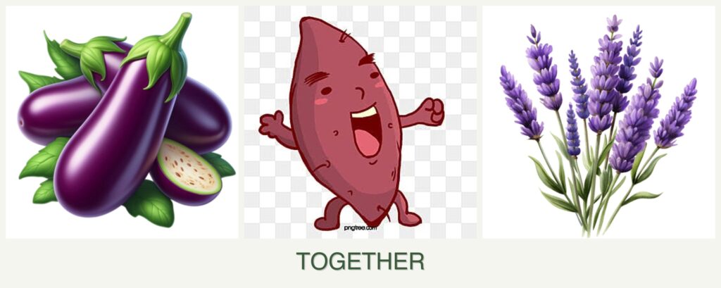 Growth Requirements: Eggplants and sweet potatoes thrive in warm, sunny environments with well-drained soil, making them compatible in terms of sunlight and soil conditions. Lavender also prefers full sun and well-drained soil but needs less water than the other two.