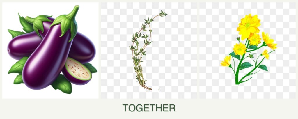 - Growth Requirements: Eggplants need more nutrients and water, while thyme and calendula are less demanding, reducing competition.