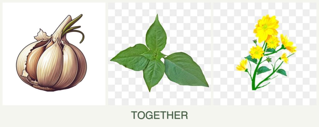 - Pest Control: Garlic’s strong scent deters pests, protecting basil and calendula. Basil’s aromatic oils also repel insects.