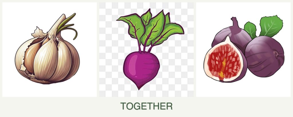 Figs: Figs, being larger and more demanding in terms of space and water, can still coexist with garlic and beets if planted strategically. Ensure figs are positioned to avoid shading the smaller plants and that their root systems do not compete excessively.