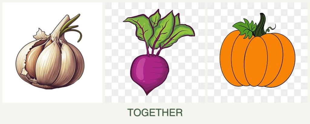 - Growth Requirements: Garlic and beets have similar soil and watering needs, while pumpkins require more space and sunlight.