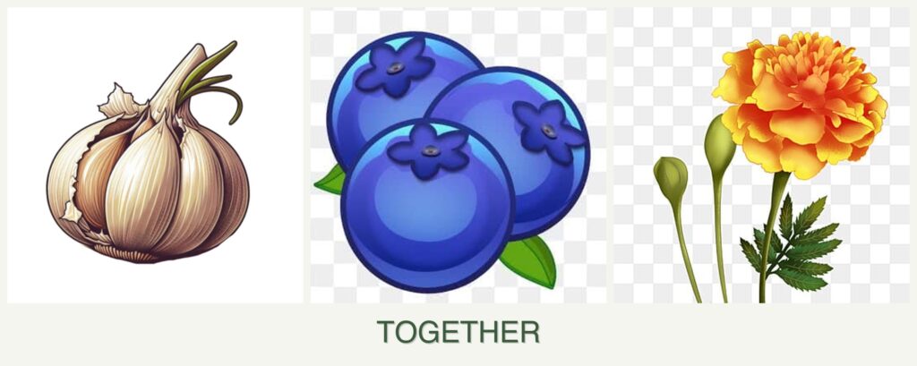- Nutrient Needs: Blueberries require high organic matter and specific nutrients like iron, which may not align with the needs of garlic and marigolds.