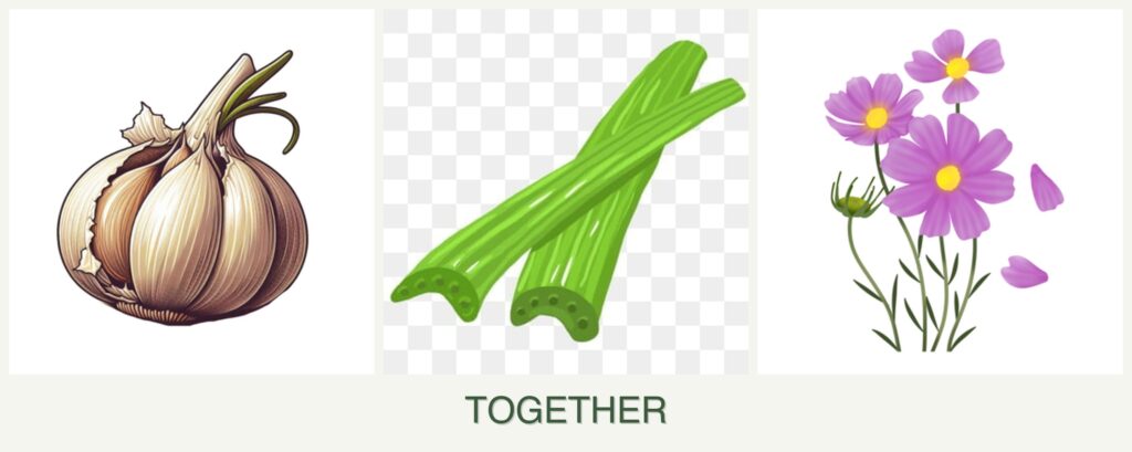 - Pest Control: Garlic’s natural pest-repellent properties can protect celery and cosmos from certain insects.