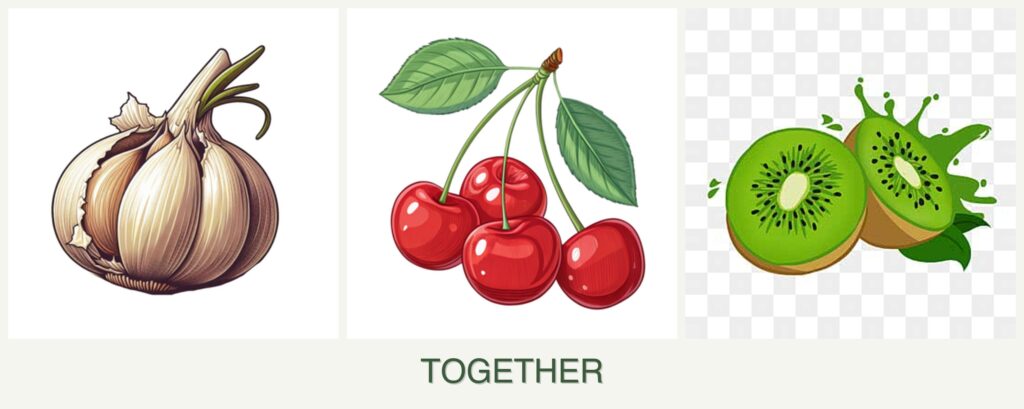 Companion Plants: Pair garlic with carrots or tomatoes, while cherries and kiwis can be planted with other fruit trees or vines that share similar growing conditions.