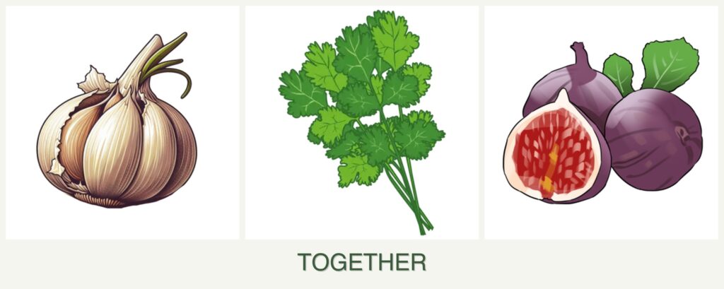 - Growth Requirements: Garlic and cilantro prefer cooler temperatures, whereas figs thrive in warm climates.