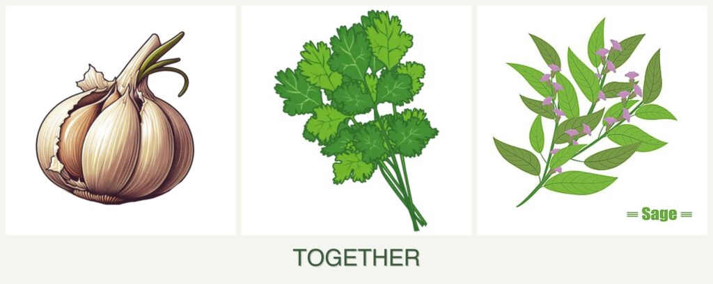 Competition for Resources: Garlic’s heavy nutrient demands may affect cilantro and sage if not managed with proper fertilization.