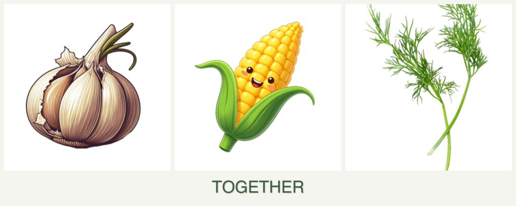 Competition for Resources: Corn’s high nutrient and water demands can overshadow garlic and dill if not managed properly.