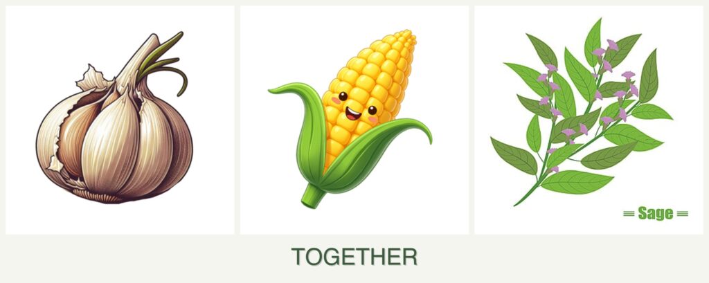Garlic thrives in full sun with well-drained soil and requires moderate watering. Sage, a hardy herb, prefers similar conditions but can tolerate drier soil. Corn, however, needs more water, nutrient-rich soil, and ample space due to its tall growth habit. The differing water and nutrient needs make it challenging to plant these three together without one or more plants suffering.