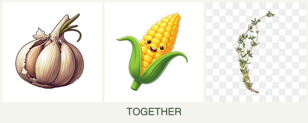 - Growth Requirements: Garlic prefers well-drained soil, corn needs rich, fertile soil, and thyme thrives in slightly sandy conditions.