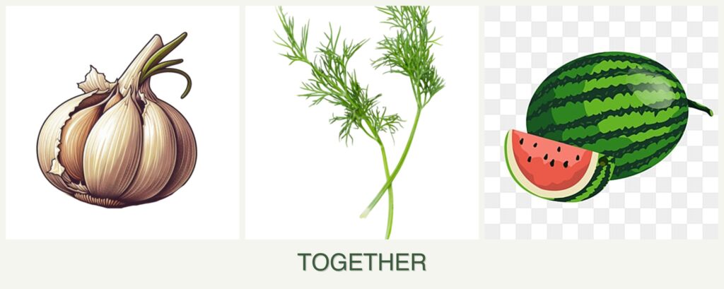 - Nutrient Needs: Melons are heavy feeders, potentially depriving garlic and dill of nutrients.