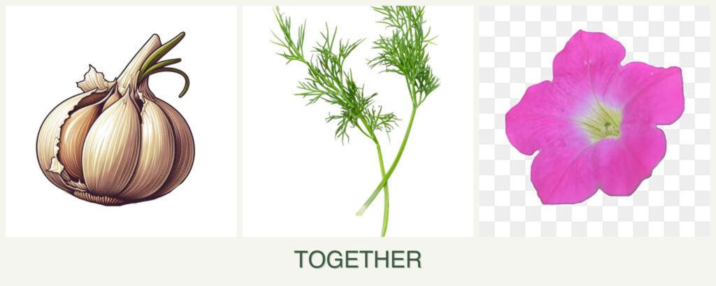 Competition for Resources: Garlic’s bulbous growth may compete with dill and petunias for nutrients and water if not spaced properly.
