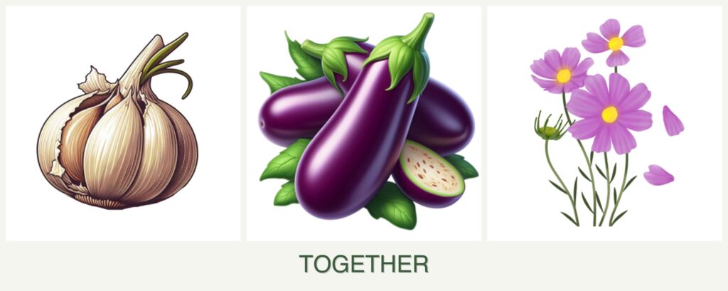 Pest Control: Garlic is known for its pest-repelling properties, which can benefit both eggplant and cosmos by deterring harmful insects.