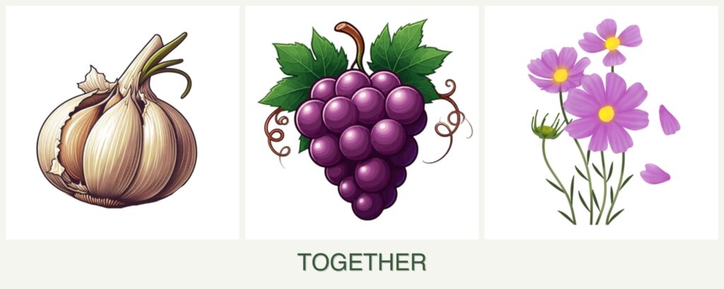 - Pest Control: Garlic’s natural sulfur compounds repel many pests, benefiting grapes and cosmos.