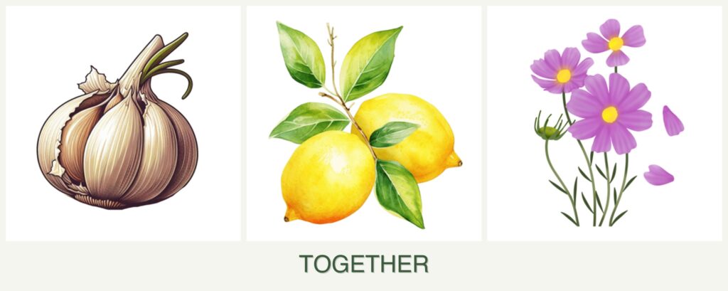 - Pest Control: Garlic is known for its pest-repelling properties, which can benefit nearby plants. However, lemons and cosmos do not have significant pest-repelling abilities.