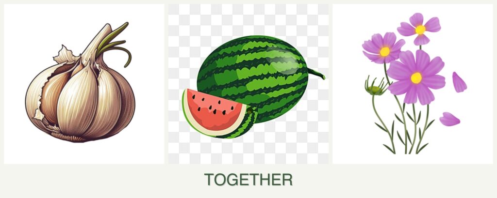 Pest Control: Garlic is known for its pest-repelling properties, which can benefit melons by deterring aphids and other pests. Cosmos attracts beneficial insects like bees and butterflies, enhancing pollination for melons.