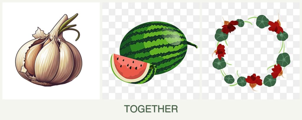 - Pest Control: Garlic repels aphids and other pests. Nasturtiums attract pollinators and beneficial insects while deterring pests from melons.