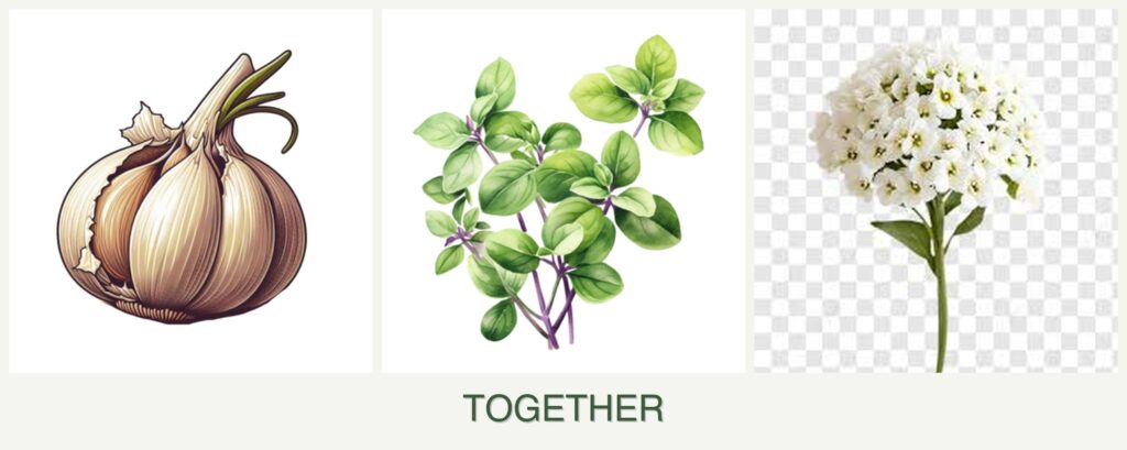 - Pest Repellent Properties: Garlic’s sulfur compounds repel aphids and beetles, protecting oregano and alyssum.