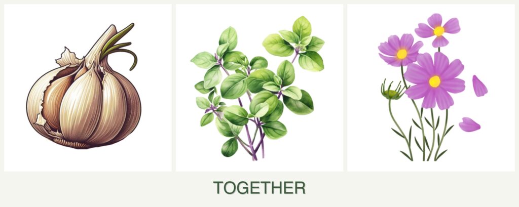 Pest Repellent Properties: Garlic’s strong aroma deters many garden pests, protecting oregano and cosmos.