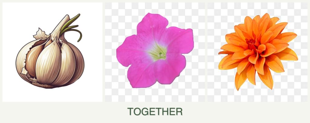 Avoid planting garlic with legumes, as they can inhibit each other’s growth. Petunias and dahlias have fewer specific restrictions but avoid overcrowding.