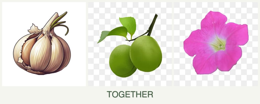 Garlic thrives in full sun with well-drained soil, and it helps repel pests that might otherwise target plums. Plums prefer well-drained, slightly acidic soil and full sun. Petunias, also sun-loving, can adapt to various soil types, making them versatile companions. The key is to ensure each plant’s needs are met without competition for resources.