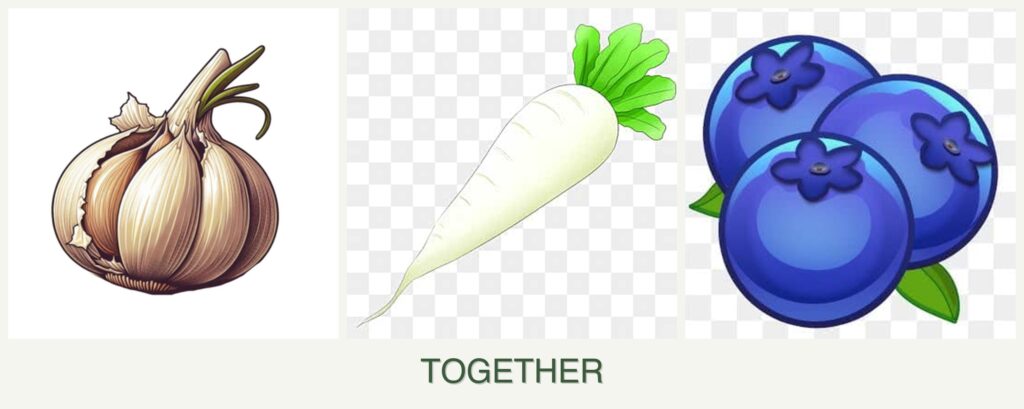 Pest Control: Garlic acts as a natural pest repellent, which can benefit radishes but does not significantly affect blueberries.