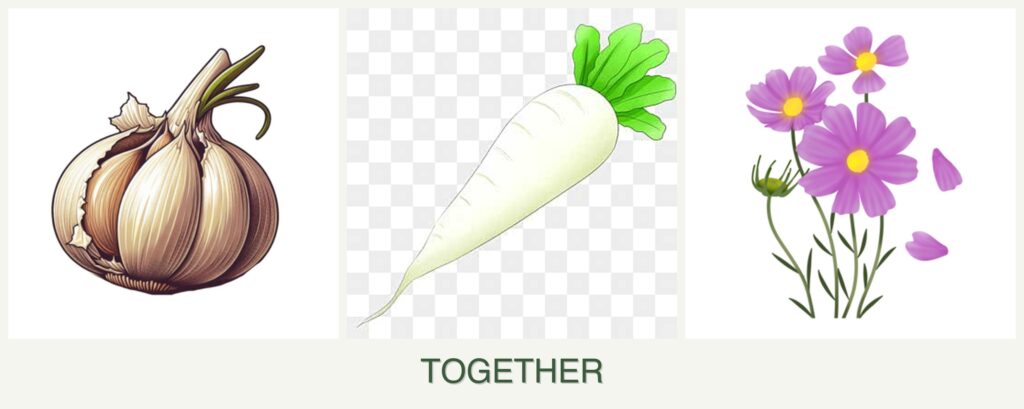 Planting garlic, radishes, and cosmos together offers several advantages: