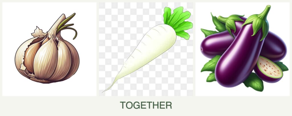 Pest Repellent Properties: Garlic’s natural compounds help repel common pests, providing a protective barrier for eggplants and radishes.