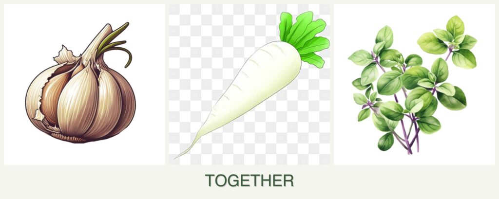 - Pest Control: Garlic’s pungent scent helps repel pests that might otherwise target radishes and oregano.