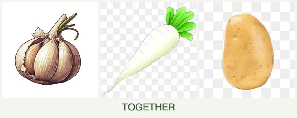 - Growth Requirements: Garlic, radishes, and potatoes have different growth habits. Garlic grows taller, while radishes and potatoes stay lower to the ground. This can help maximize space and sunlight exposure.