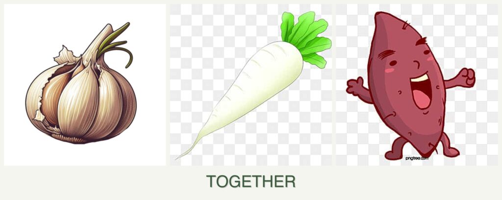 Planting garlic, radishes, and sweet potatoes together can offer several advantages: