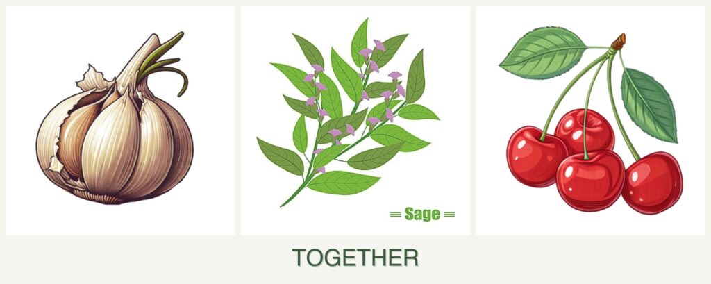 Cherries with Garlic and Sage: Cherries, being trees, have different needs compared to herbs like garlic and sage. They require more space and a different soil pH. However, planting garlic around the base of cherry trees can help deter pests and improve the soil’s health.