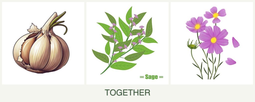 - Pest Control: Garlic and sage help deter pests like aphids and snails, which can benefit cosmos.