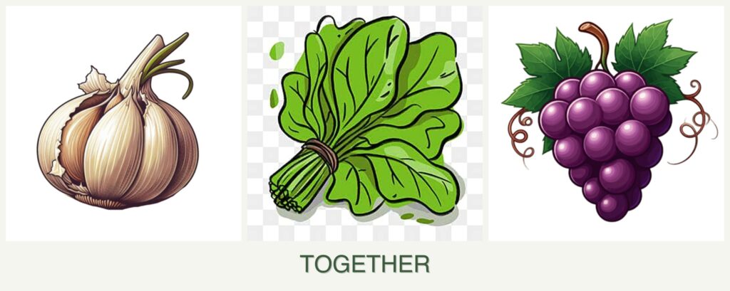 Grapes require ample sunlight and space but benefit from garlic’s pest-repelling abilities. However, they have different water and nutrient needs compared to garlic and spinach.
