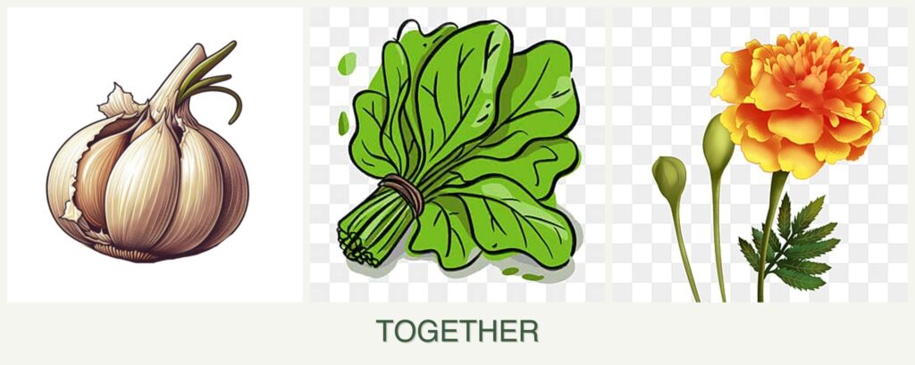 Planting garlic, spinach, and marigolds together offers numerous benefits:
