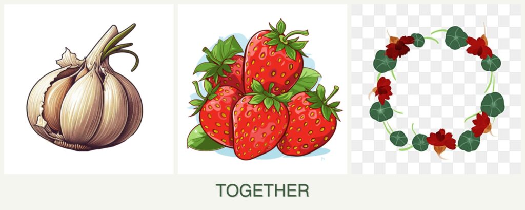 - Garlic acts as a natural pest repellent, deterring aphids and other insects that might harm strawberries and nasturtiums.