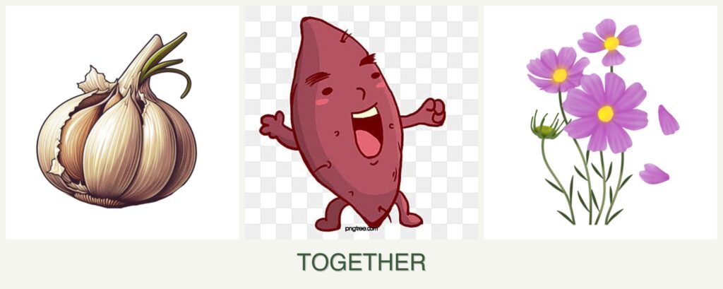 - Pest Repellent Properties: Garlic acts as a natural pest deterrent, protecting sweet potatoes and cosmos from common garden pests.