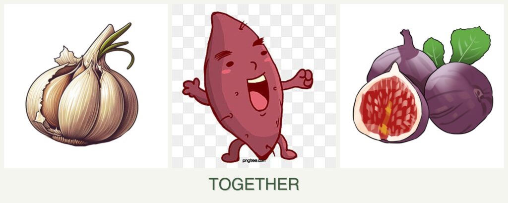 While garlic, sweet potatoes, and figs are not ideal companions, planting them in proximity can offer some benefits if managed correctly: