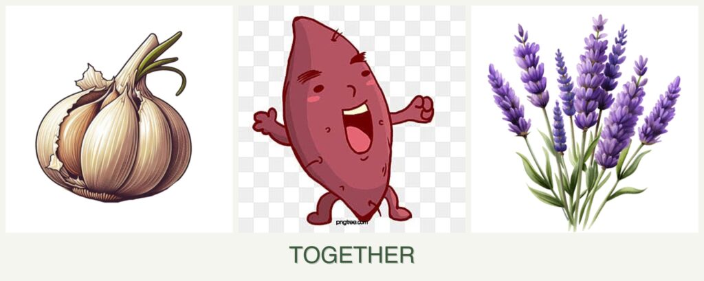 - Growth Requirements: Lavender’s need for dry conditions conflicts with the moist environment sweet potatoes prefer. Garlic’s cool-season growth cycle also contrasts with the warm-season needs of sweet potatoes.