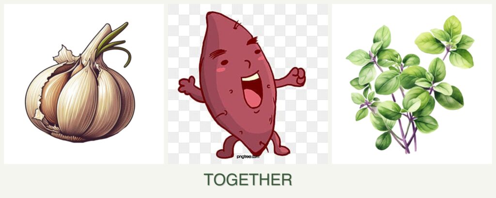 Pest Control: Garlic is known for its pest-repellent properties, which can benefit sweet potatoes by deterring common pests like aphids. Oregano’s aromatic oils can also help in keeping pests at bay.