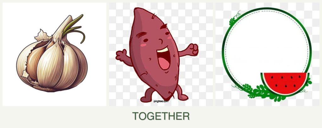 Though not ideal as a trio, garlic, sweet potatoes, and watermelons each have benefits when paired with other plants: