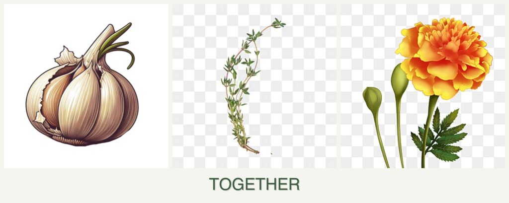 - Timing: Plant garlic in the fall, thyme in spring or fall, and marigolds after the last frost.