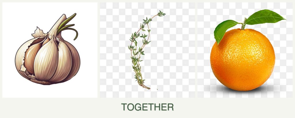 - Pest Control: Garlic helps repel aphids and other pests that might affect thyme and oranges.